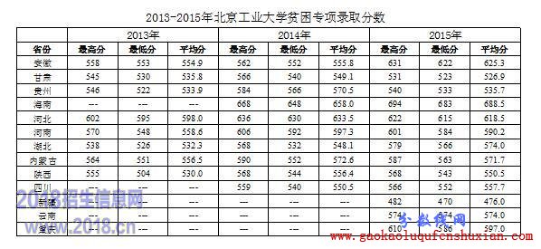 北京工业大学2013-2015年录取分数统计(贫困专项)