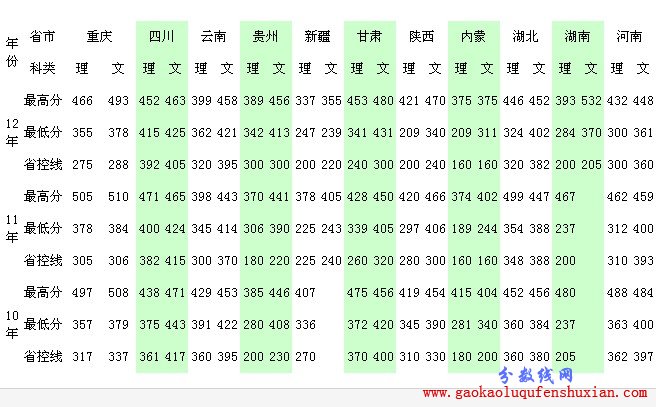 重庆三峡医药高等专科学校2010~2012年分省招生录取分数线统计表