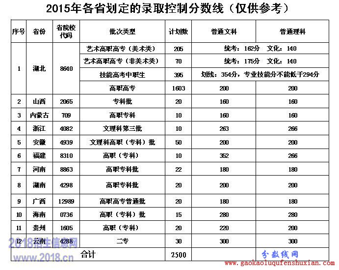 武汉信息传播职业技术学院2015年各省划定的录取控制分数线(仅供参考)